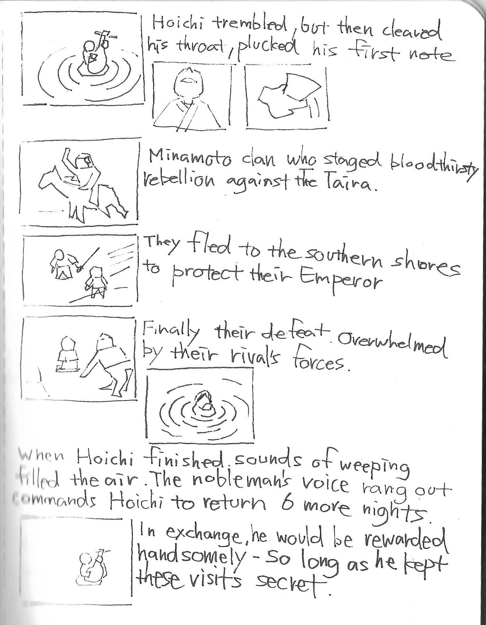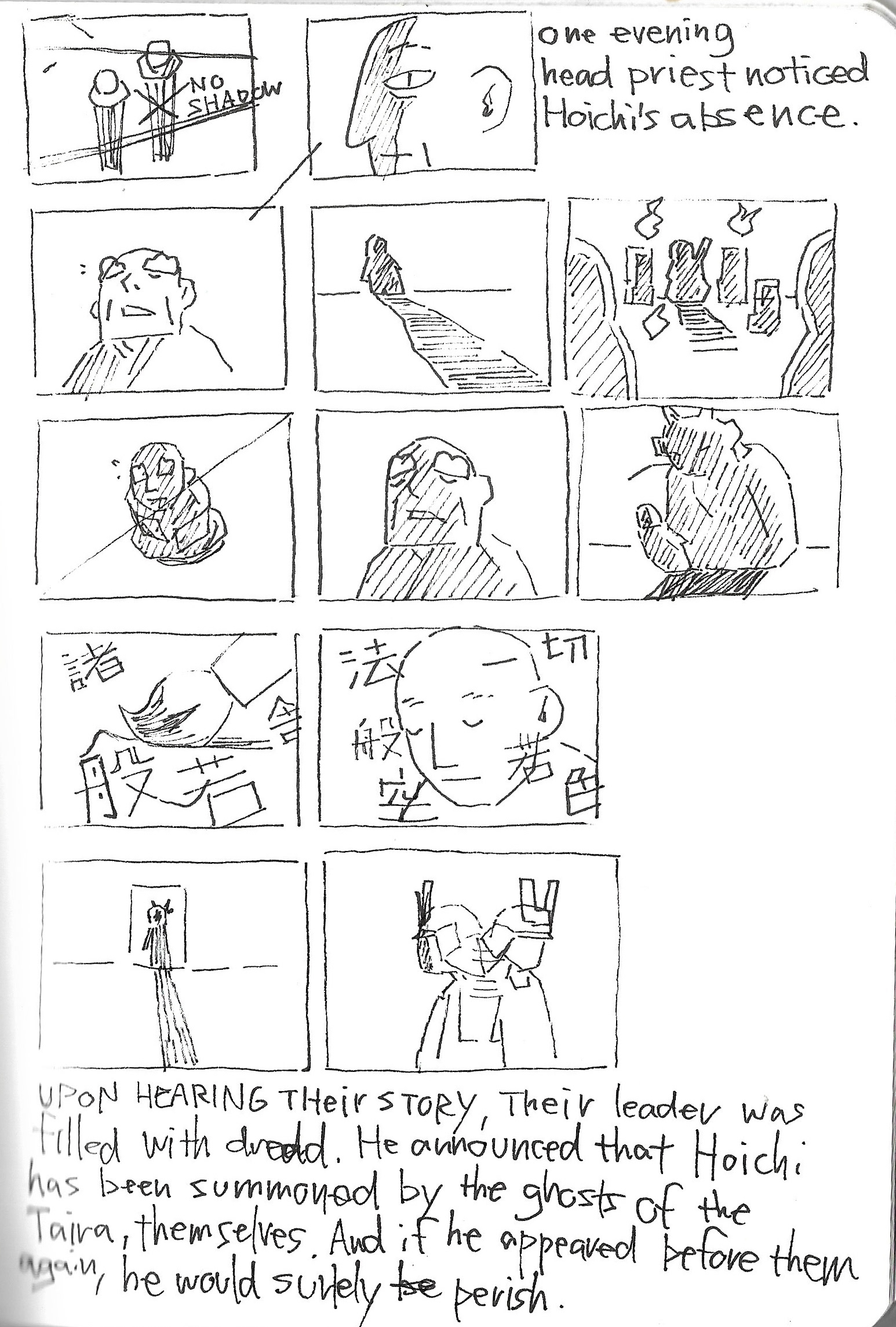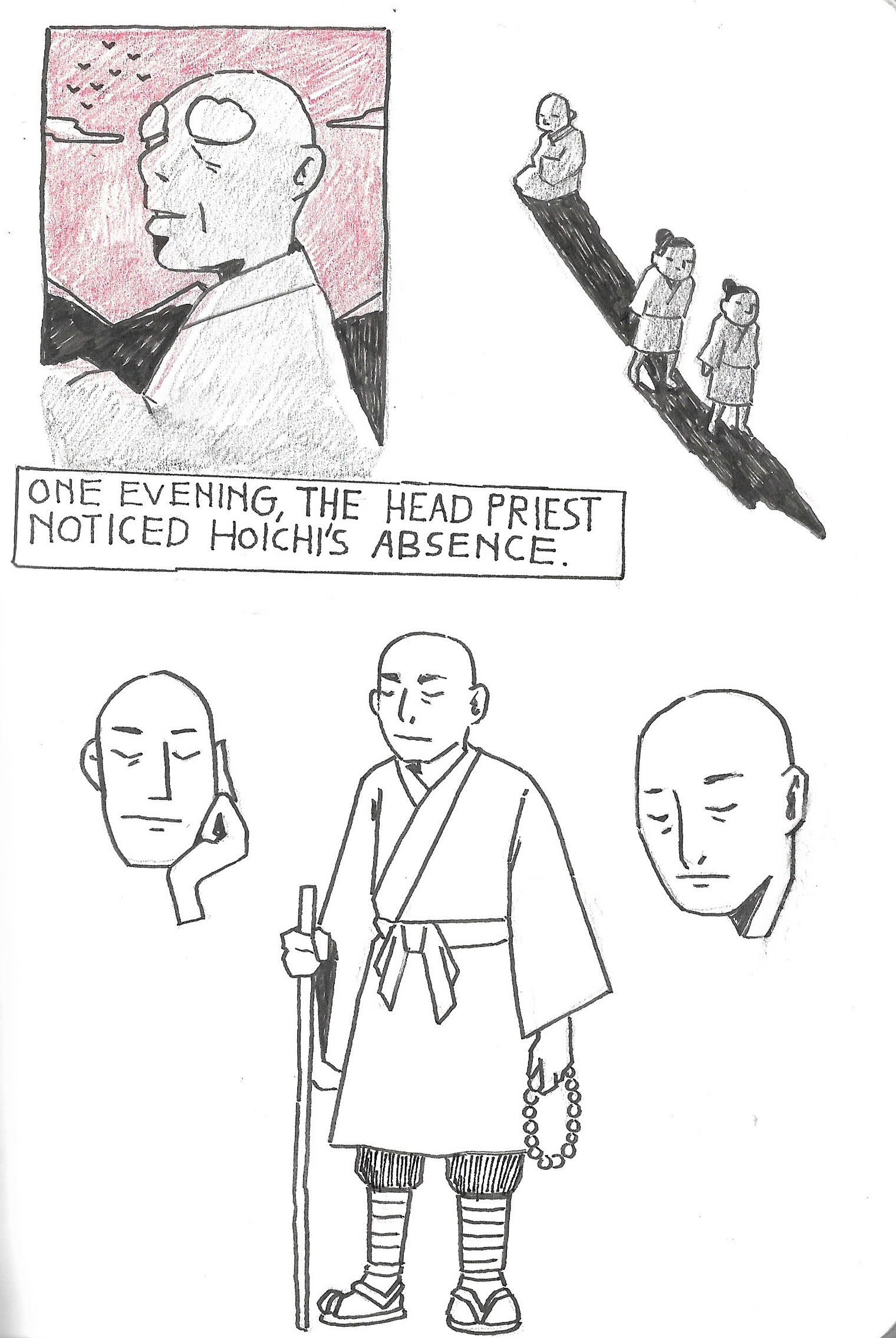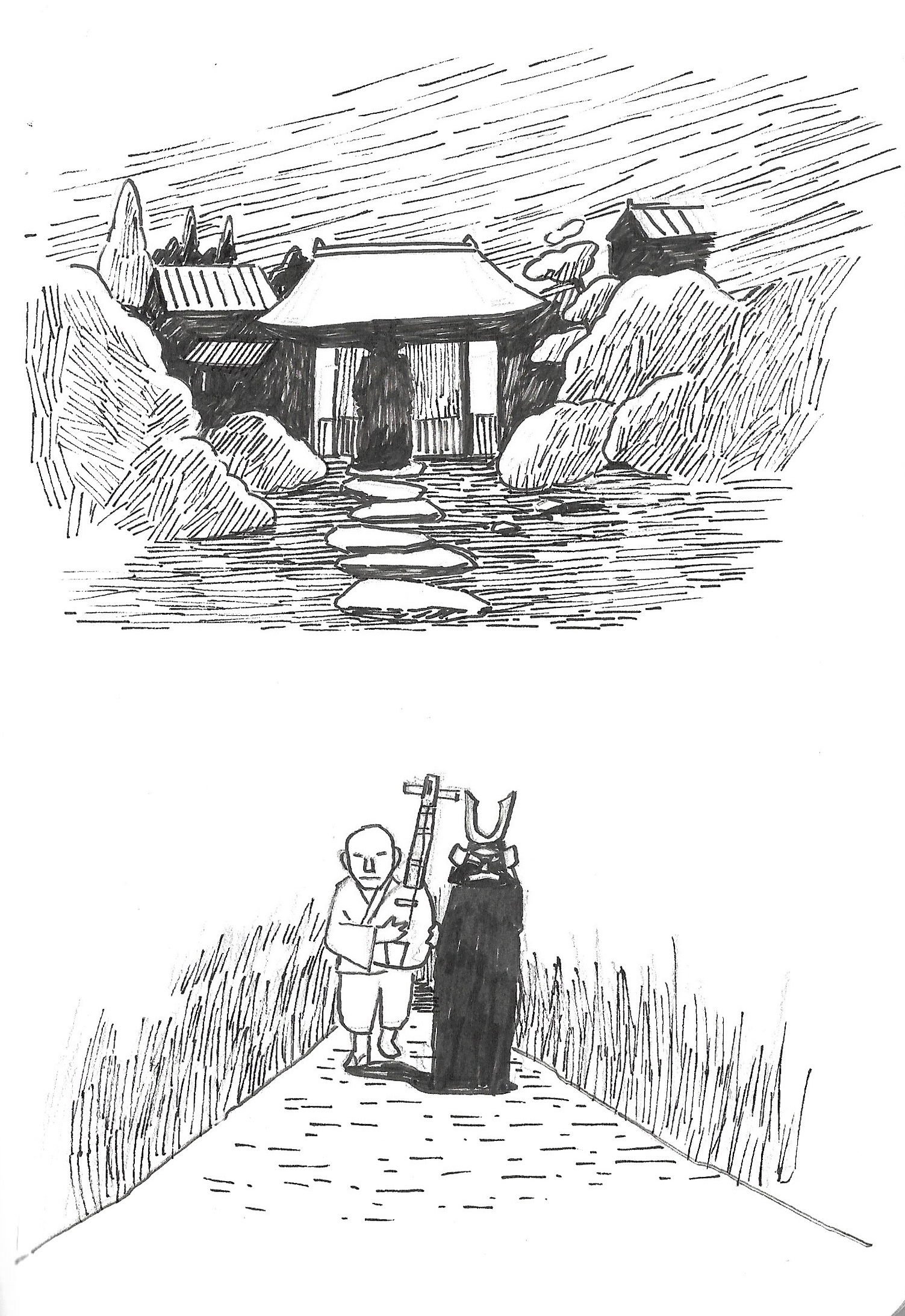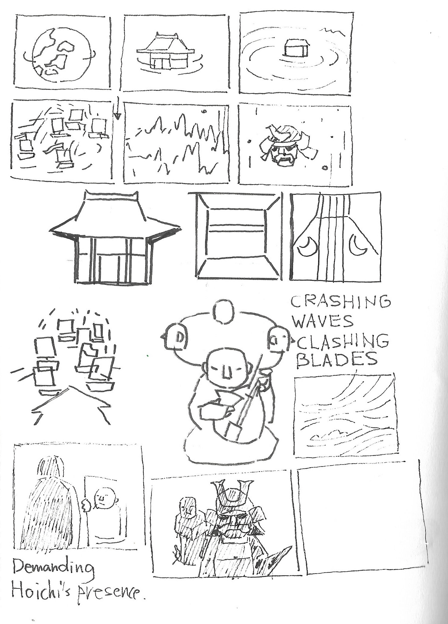 As usual for this scale of project, I start with a sketchbook; thumbnails of sequences, scenes, and characters. The challenge was that you need to build the whole world, yet not enough photographic references to draw from. I drew a chunk of references from Kwaidan(1964) Hoichi the Earless film, though I still needed to come up with plenty on my own. It was also quite different from the last TED-Ed “Ice Cream” film where I can have various different visuals one after another. This was more story driven, but still needed interesting visuals from one after another. At the beginning I’m overwhelmed with the amount of work, and underwhelmed with the ideas that I could come up with, but I keep going over and over until things started falling into places.