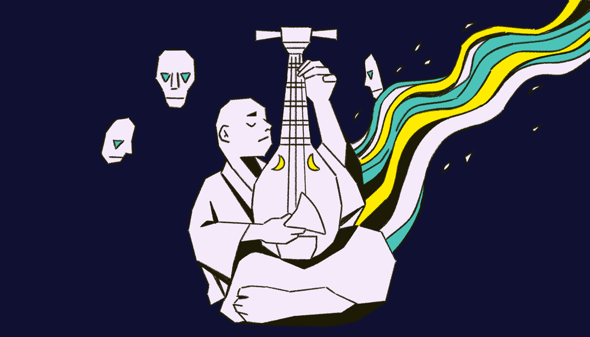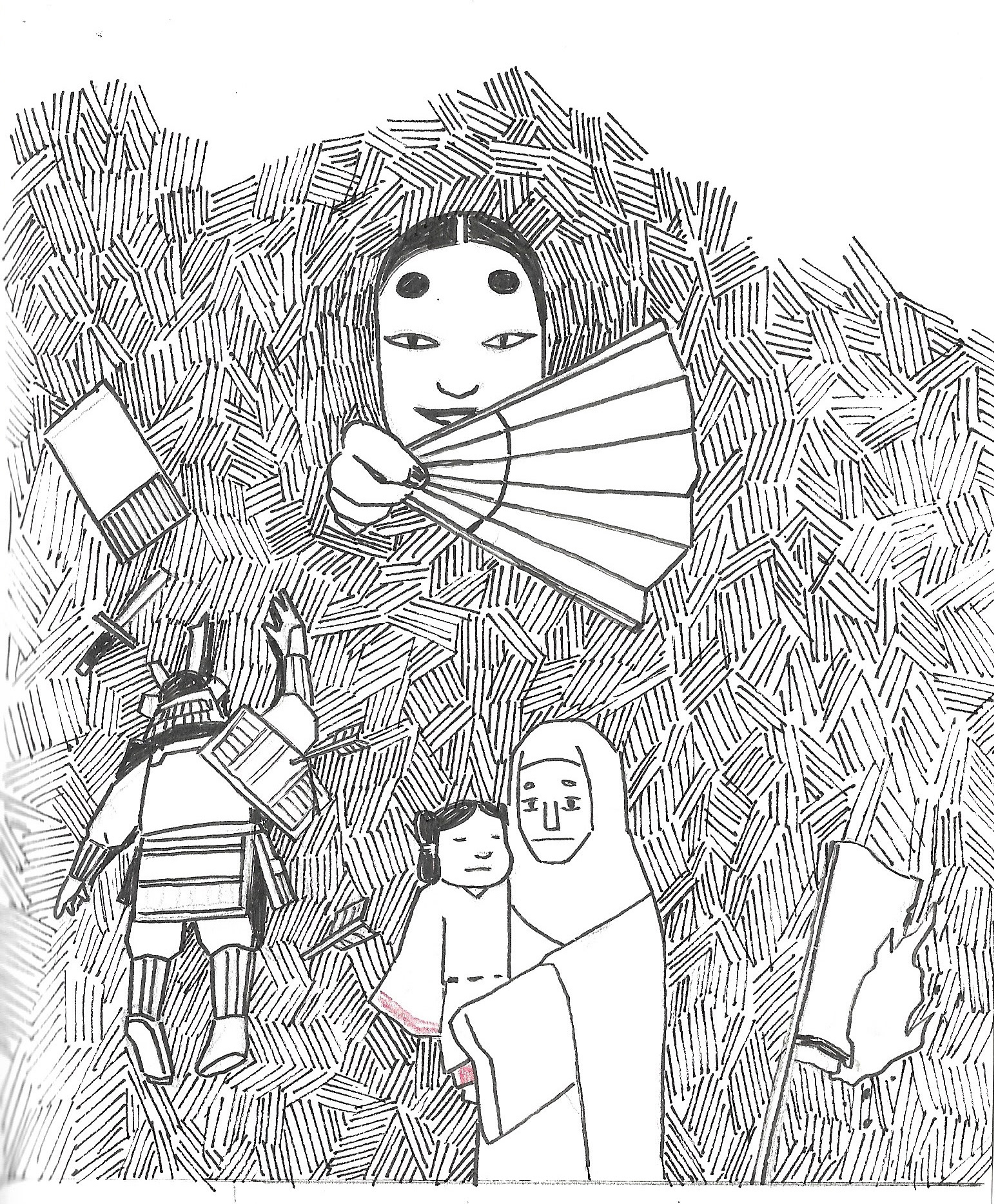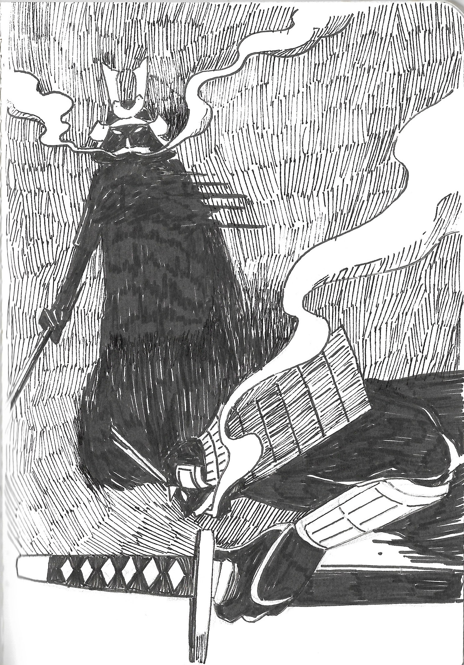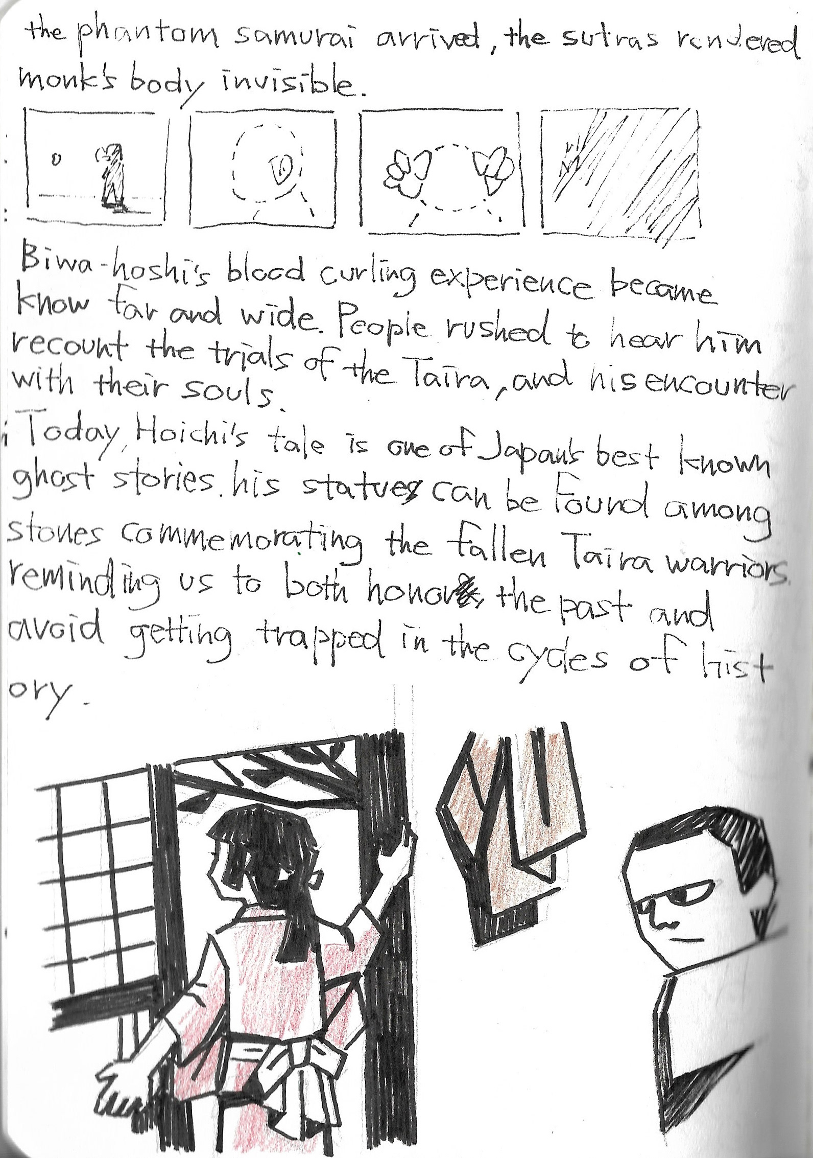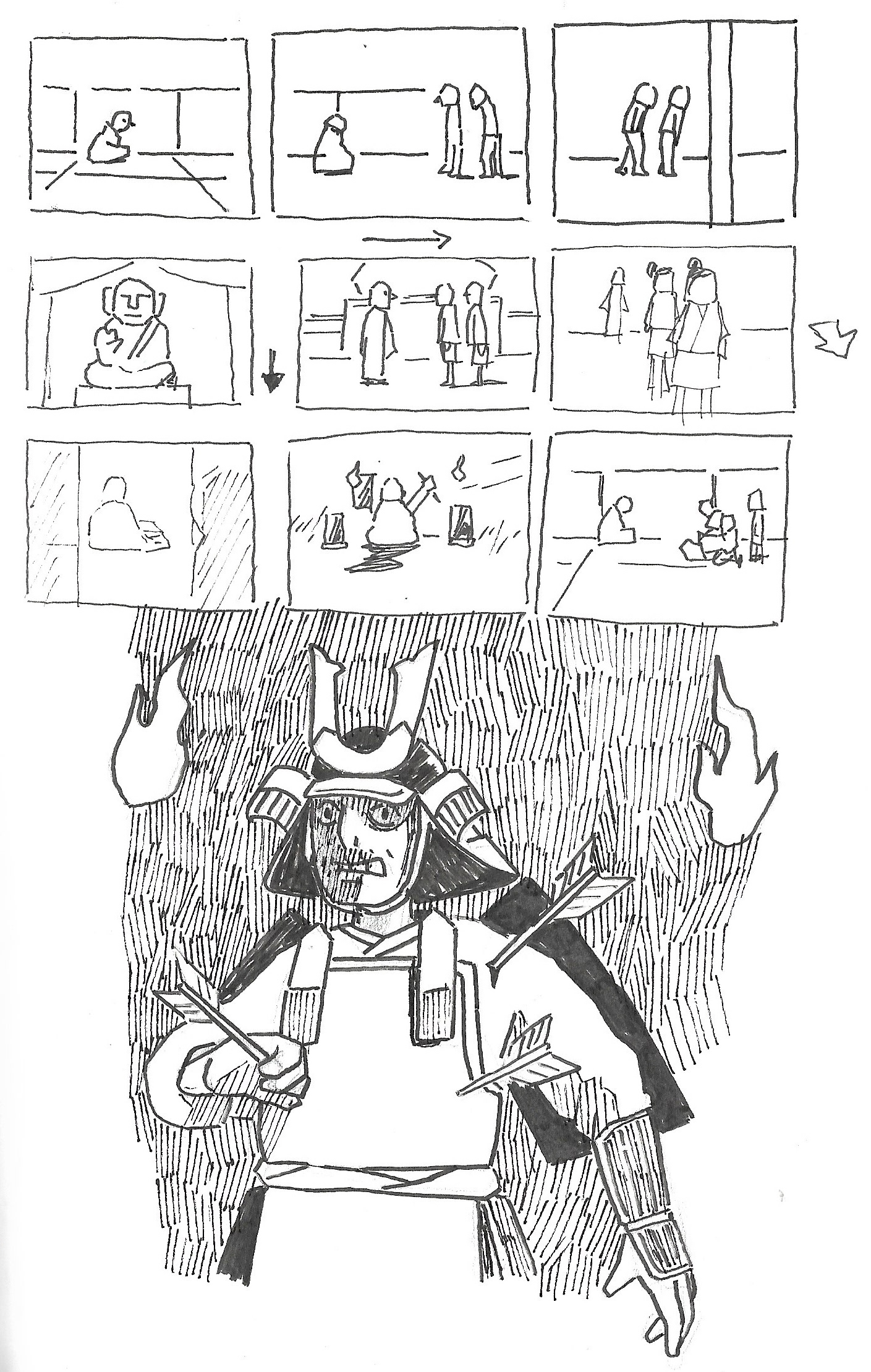 As usual for this scale of project, I start with a sketchbook; thumbnails of sequences, scenes, and characters. The challenge was that you need to build the whole world, yet not enough photographic references to draw from. I drew a chunk of references from Kwaidan(1964) Hoichi the Earless film, though I still needed to come up with plenty on my own. It was also quite different from the last TED-Ed “Ice Cream” film where I can have various different visuals one after another. This was more story driven, but still needed interesting visuals from one after another. At the beginning I’m overwhelmed with the amount of work, and underwhelmed with the ideas that I could come up with, but I keep going over and over until things started falling into places.